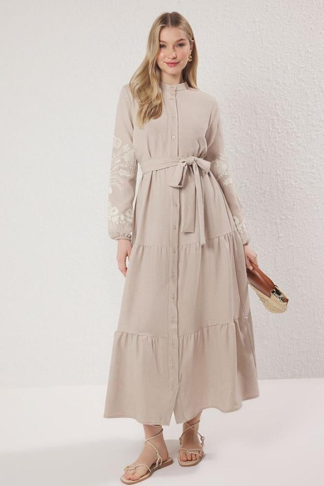 فساتين قماش كتان ستون بستايل الكتان يتميز بتطريز يدوي دقيق يضفي لمسة فخمة وأنيقة على إطلالتك. يأتي بلون بيج مع أكمام مطرزة ورباط خصر يبرز جمال التصميم، مما يجعله خيارًا مميزًا للسهرات والمناسبات الخاصة مع Mymfashion.
