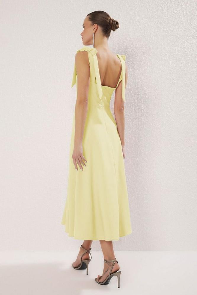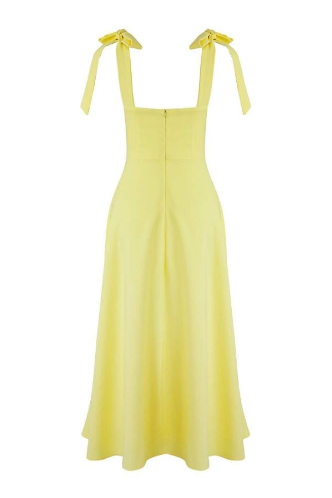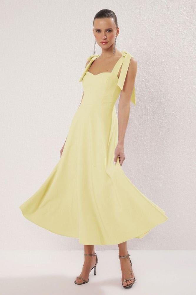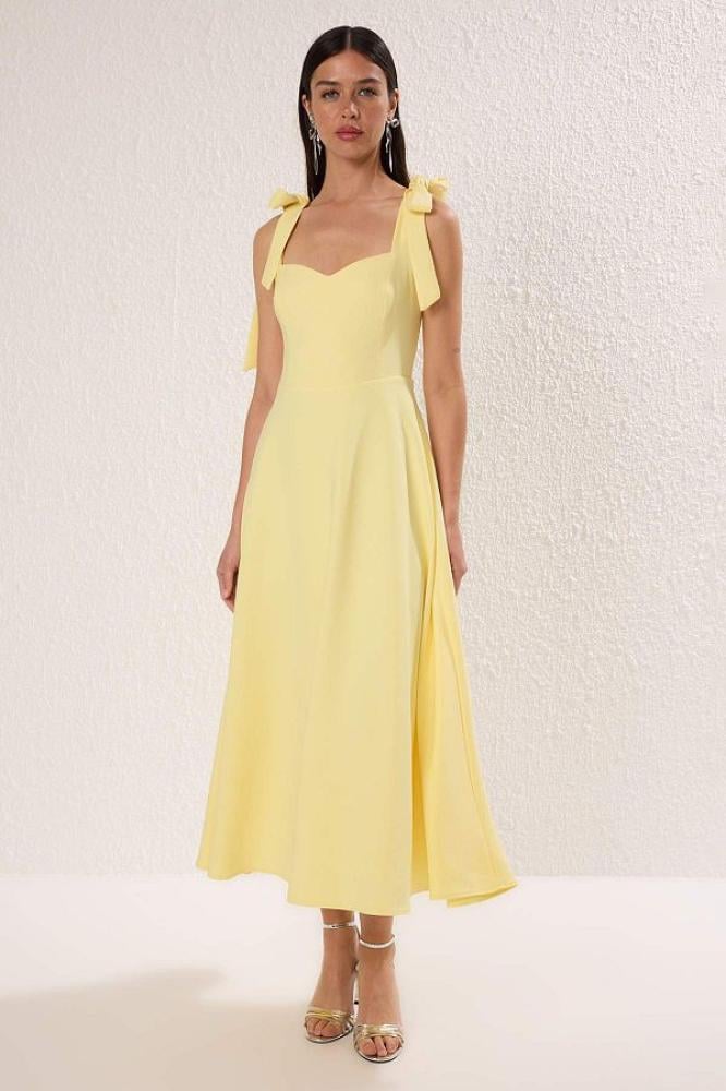- قصّة فستان اصفر ناعم A-Line تمنح الجسم شكلاً متناسقاً جذاباً