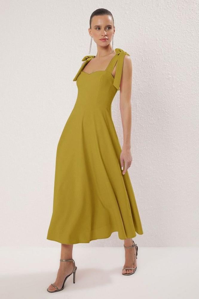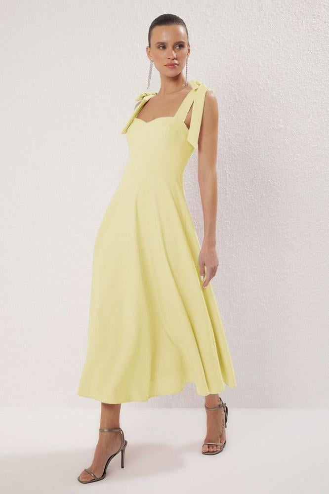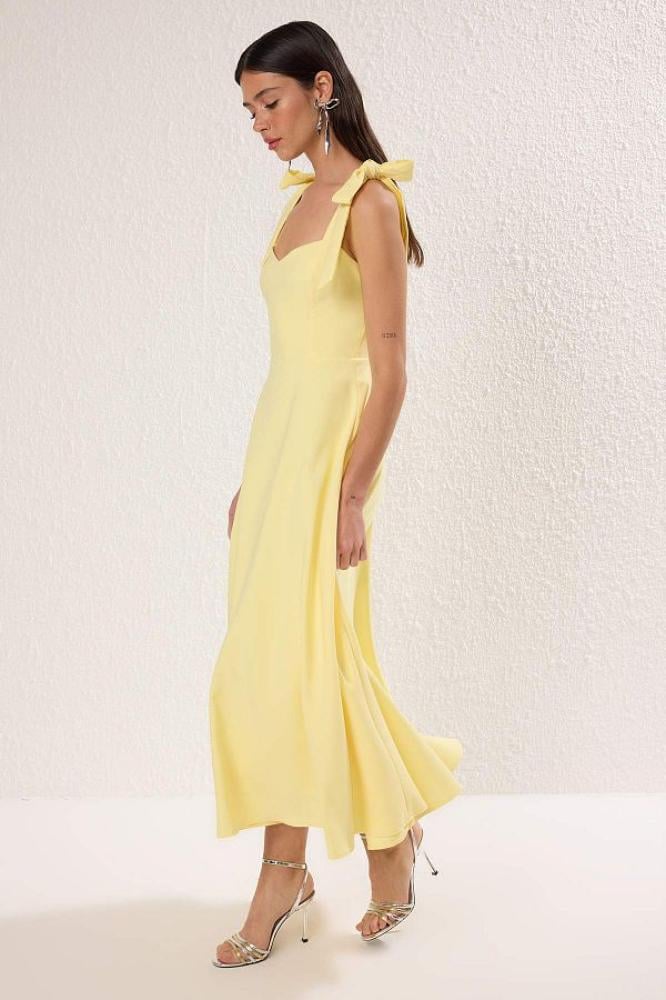 فستان اصفر ناعم ميدي بقصّة A-Line أنثوية، يتميز بحمّالات أنيقة وتفاصيل ربط تضيف لمسة جذابة على الخصر. تصميمه البسيط والمميز يجعله مثالياً للسهرات والمناسبات الخاصة، ويمنحك إطلالة راقية ومريحة تعكس جمالك بثقة وأناقة مع Mymfashion.
